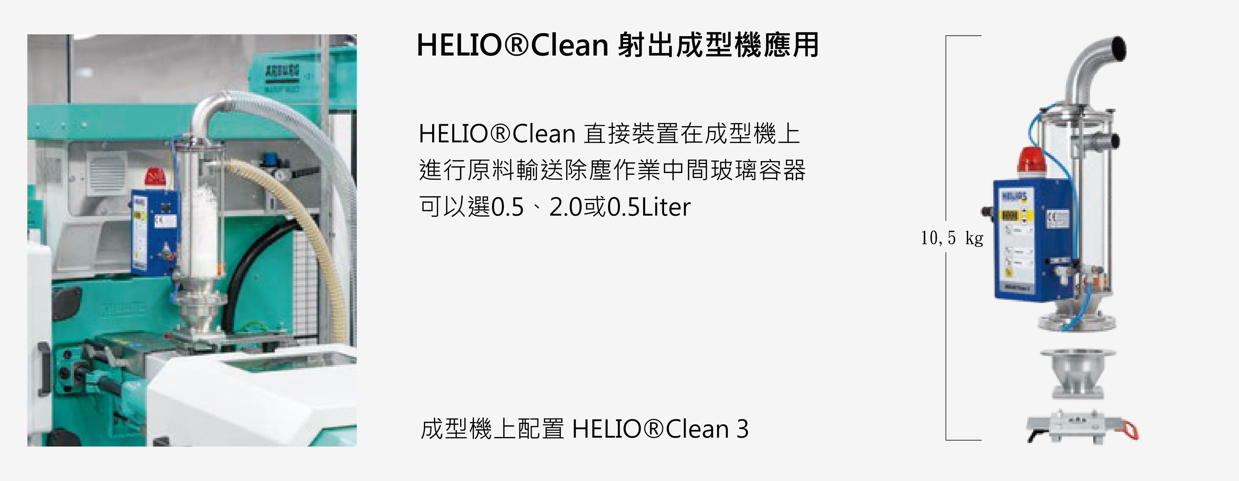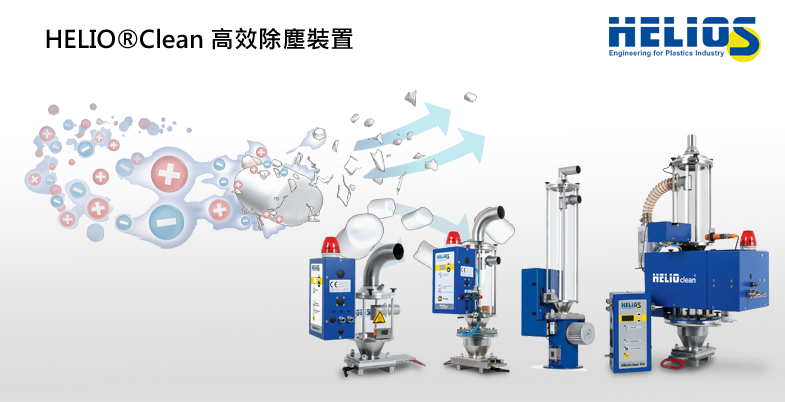 藉由真空吸料管將塑料吸引至除塵區以批次輸送100-200克顆粒(新料或回收料)至玻璃管內透過 除靜電裝置及氣體脈衝清洗將塑料與粉塵分離,除塵氣體連同粉塵均會被導入至專用集塵桶內 HELIO®Clean 提供客戶高效率之除塵系統,終結粉塵困擾!!