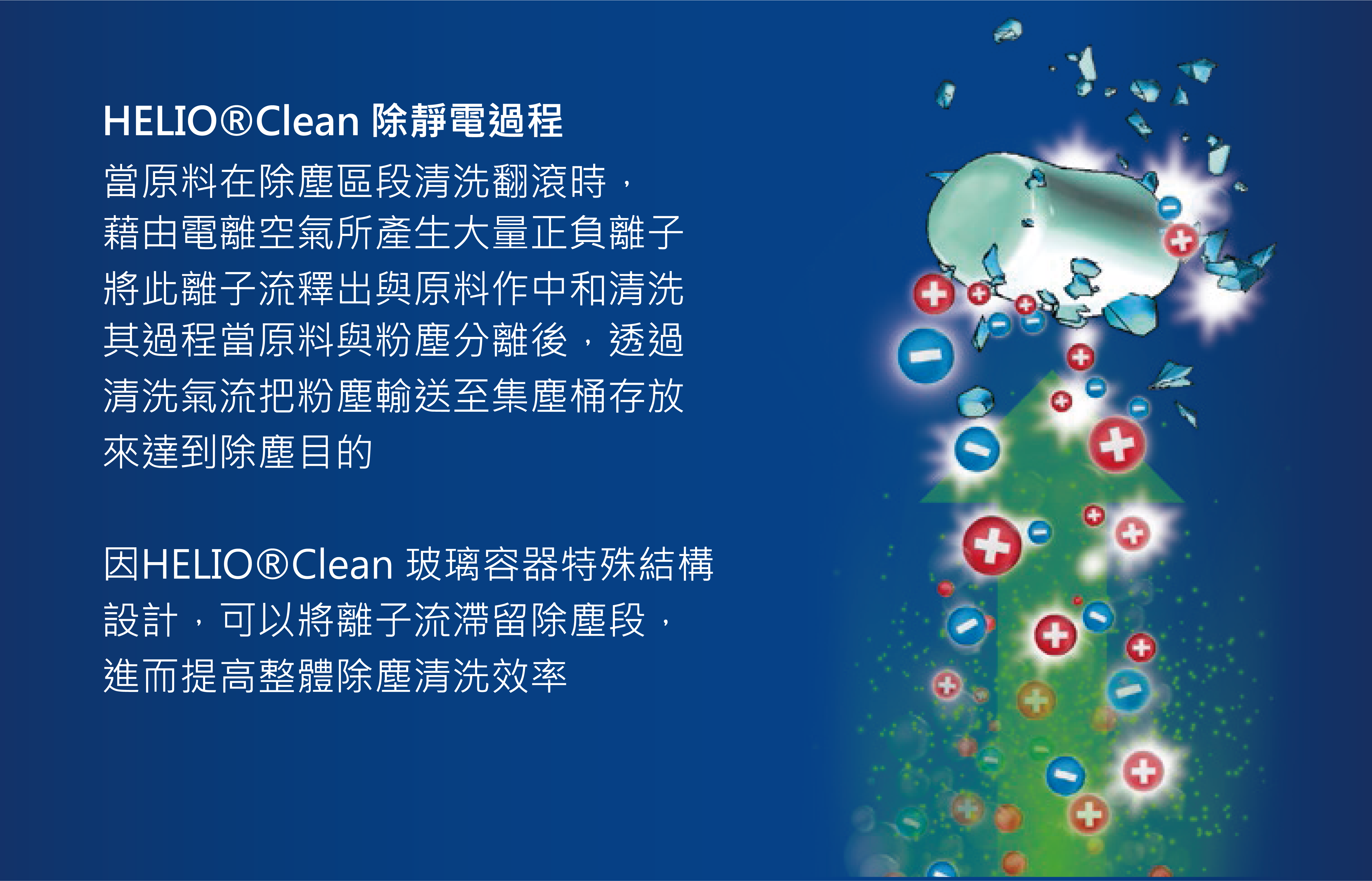 HELIO®Clean 利用離子流來清潔原料並將原料粉塵過濾分離
