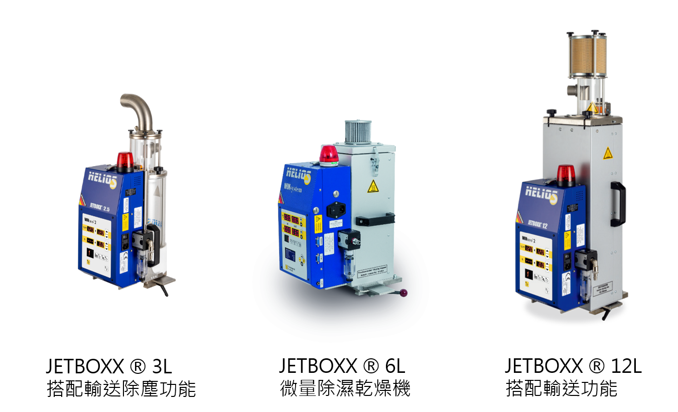 HELIOS 除濕乾燥機可直接裝設在射出成型機入料口上, 從而使乾燥後的塑料落向進料區避免冷卻回潮問題產生, 除濕主機可依烘料容器大小做搭配。